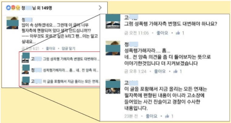여자와 사건전문 기자는 경찰이 조사 결과와 함께 ‘기소’라는 ‘송치 의견’을 검찰에 전달한 것에 큰 의미를 두는 것 같았다. 기자는 연재 포스트의 업데이트를 알리거나 남자의 범죄 증거라며 카톡 대화 내용을 게시할 때마다 ‘기소의견 송치’를 강조했고, 남자가 재판에 회부될 것이라고 주장했다. 그러면서 “범행을 반성하기는 커녕” 여자를 “끊임없이 음해하고 흠집내기를 시도”했다며 남자 측을 맹비난했다[그림2]. 2